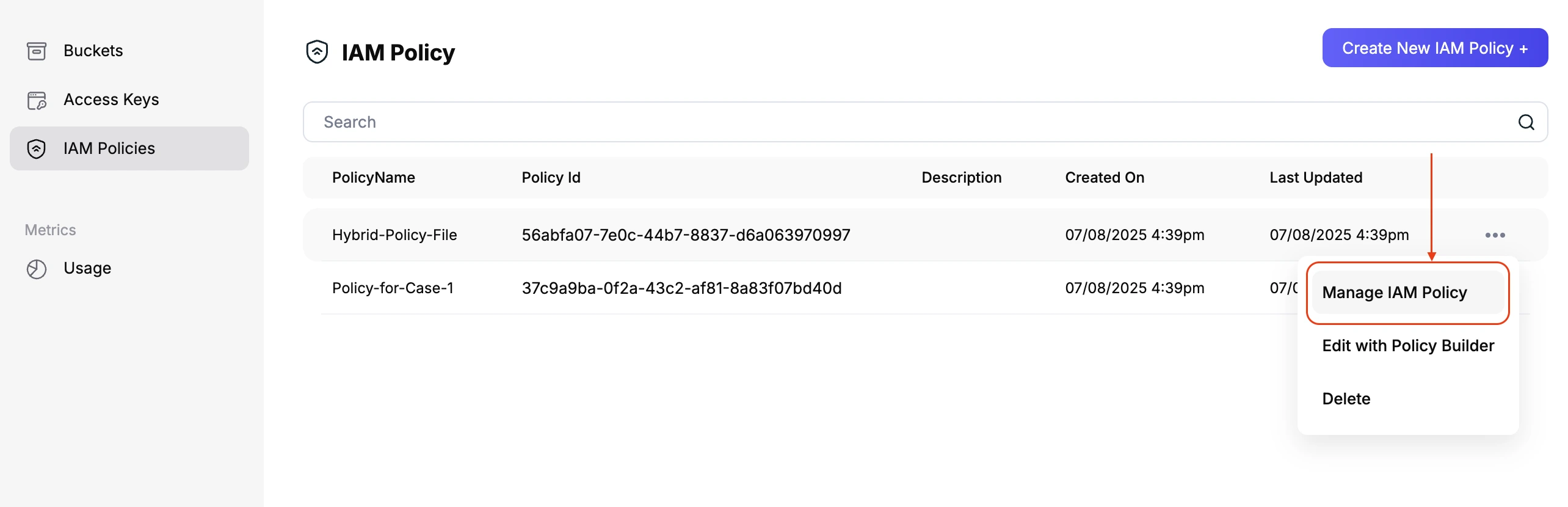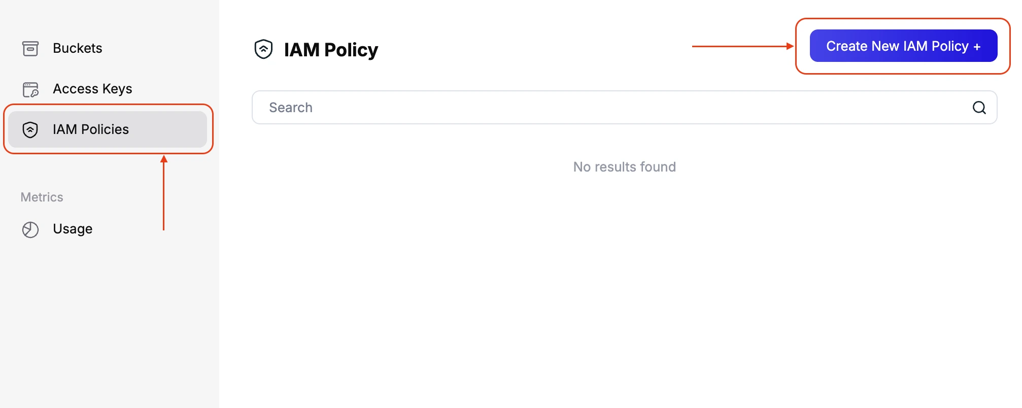 Alternatively, you can create an IAM Policy directly from the Tigris Dashboard. Navigate to "IAM Policies" in the side menu and click the Create New IAM Policy + button to start the policy creation process.