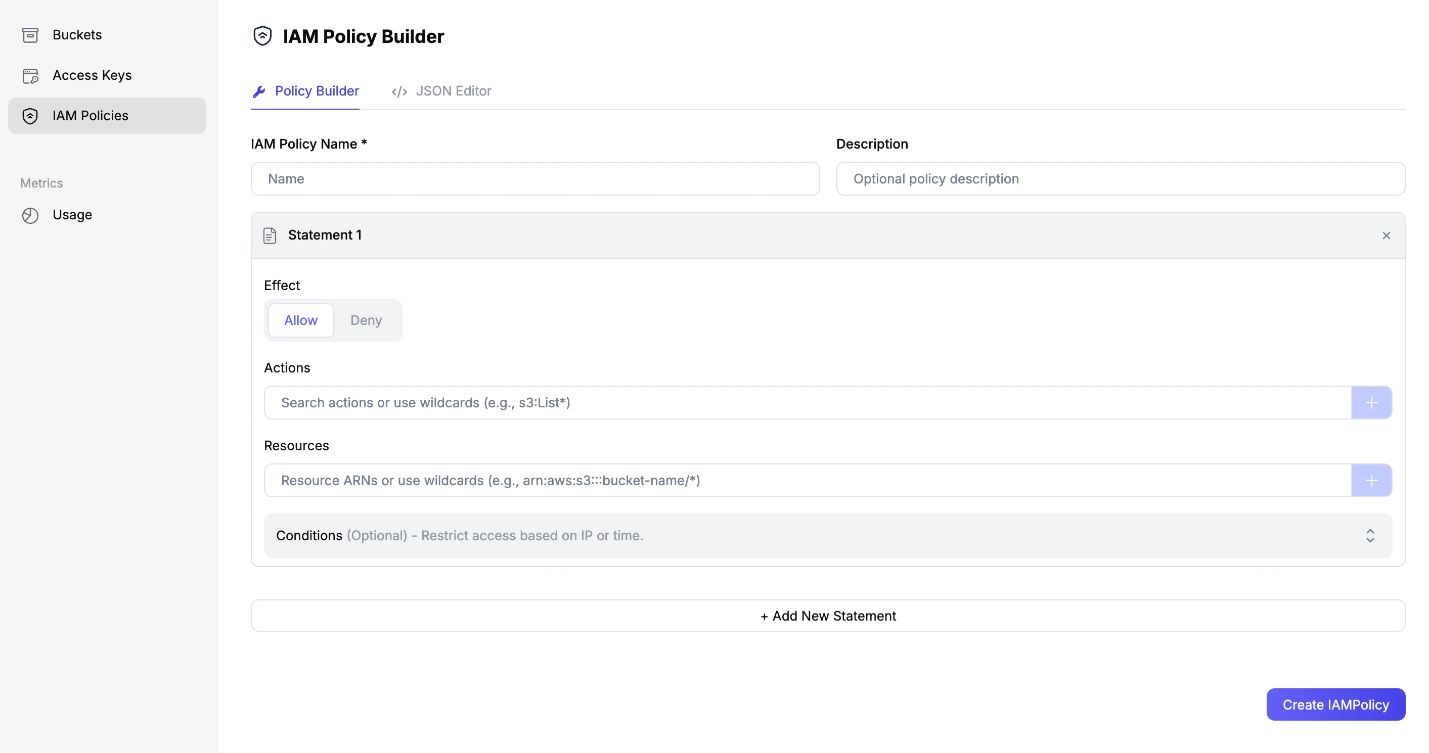 The Policy Builder makes it easy to create policies using either a simple form or the flexible JSON Editor mode — choose whichever works best for you.