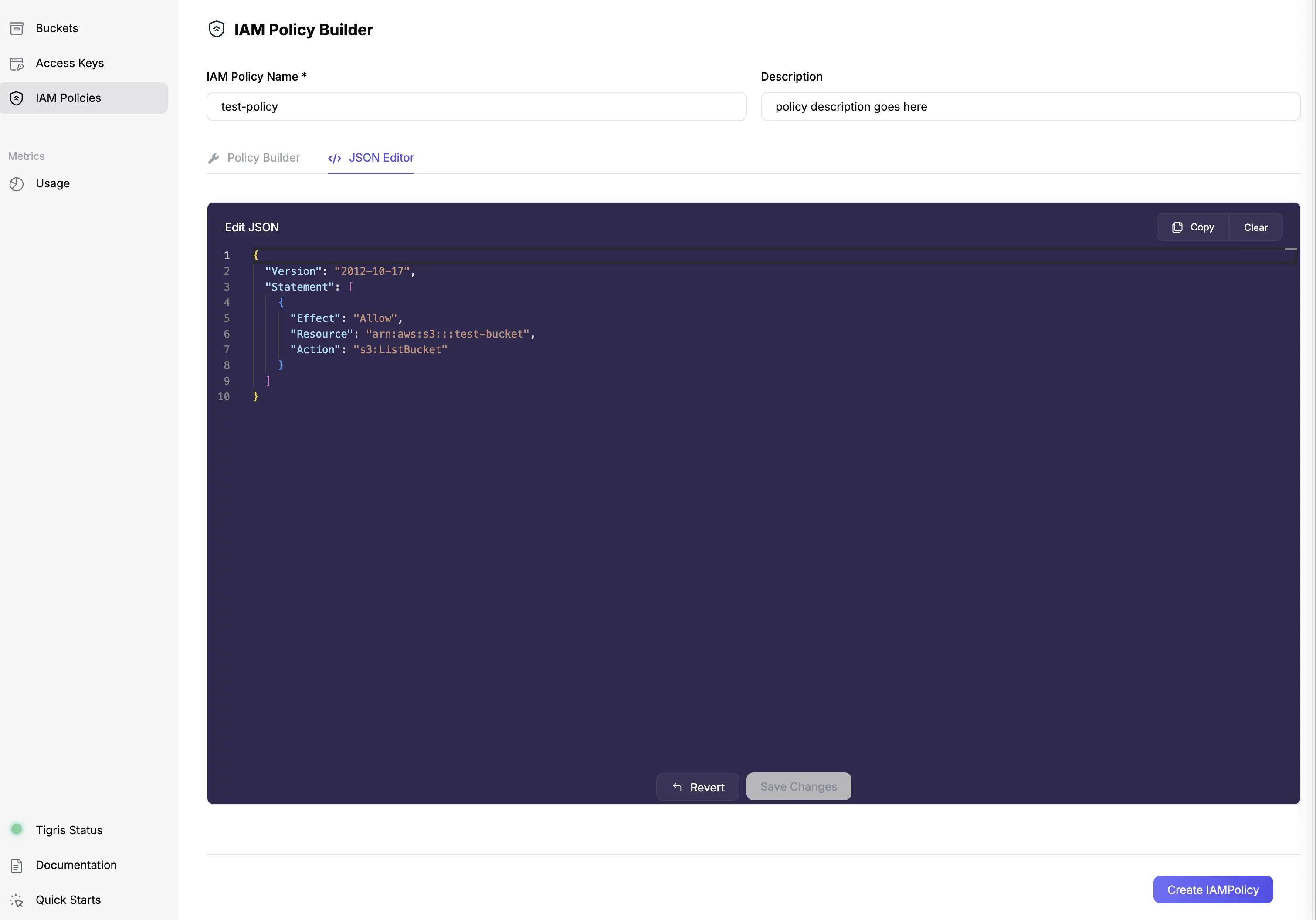 After creating your policy in the Tigris Dashboard, simply open the policy